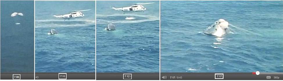 Капсула касается воды в момент 7:06 (по таймеру фильма). На кадрах капсула ещё лежит на боку. Астронавты в это время, вроде бы висят вниз головами. Слейтон при этом ухитрился показать спасателям в иллюминатор свой большой палец. По фильму, даже когда капсула приходит в вертикальное положение, спасатели ещё отсутствовали.