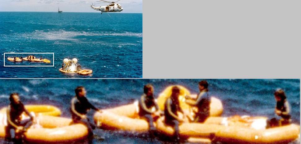 Внутри капсулы находятся в тяжёлом состоянии астронавты. Лицо спасателя слева красит обаятельная улыбка. Вероятно, спасатели знают, что в капсуле пусто. Они участвуют в тренировке по спасению корабля. Позже НАСА напишет под фотографией, что это реальное спасение корабля, якобы вернувшегося из космоса.