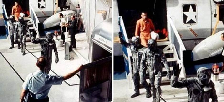 Снаружи капсулы – улыбки, внутри – якобы глубоко отравленные астронавты. Подпись к фото: «Команда пловцов занята спасением капсулы «Аполлона» сразу после приводнения в завершение совместного полёта на орбите. Астронавты остаются в капсуле, пока её доставят на борт «Нового Орлеана»».