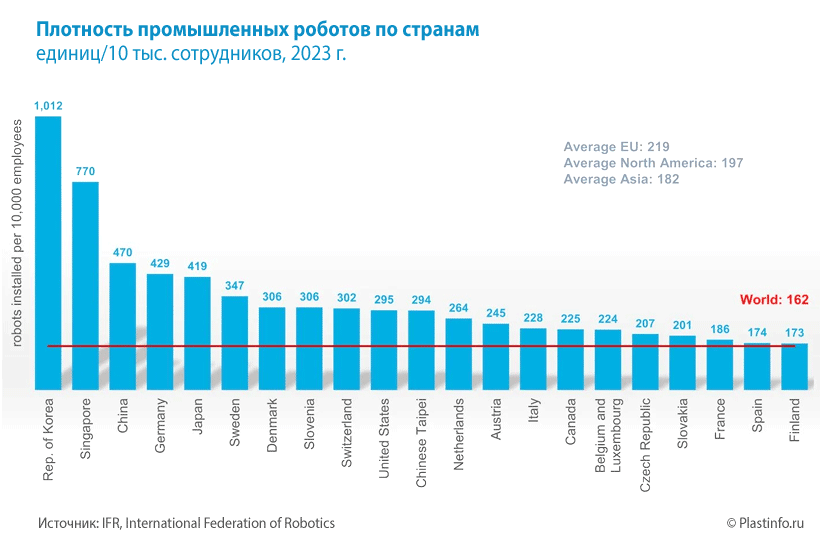 Китай уже перегнал эти страны в технологиях. Он массово внедряет роботов и собирается внедрять ещё больше. Его конкуренты перестали это делать. Это связано с тем, что закончились рынки сбыта товаров, произведённых роботами. Выяснилось, что выгоднее держать людей. Они будут покупать произведённые продукты.
