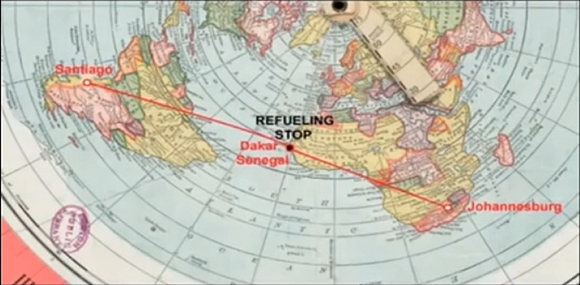 На шарообразной Земле рейс Сантьяго, Чили, в Йоханнесбург, Южная Африка, должен проходить ниже тропика Козерога в Южном полушарии. Однако каждый рейс сначала делает остановку для дозаправки в Сенегале около тропика Рака в Северном полушарии. Это имеет смысл лишь на плоской Земле.