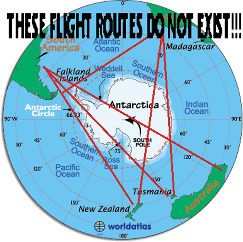 На шарообразной Земле возможны в Южном полушарии прямые рейсы над Антарктидой. Например, из Сантьяго, Чили в Сидней, Австралия. Вместо этого, все такие рейсы отклоняются от пересечения Антарктиды. Это объясняют тем, что температура слишком низкая для путешествий на самолёте! Однако, существует множество рейсов в/из/над Антарктидой. Кроме того, NASA утверждает, что у них есть технологии, которые позволяют им находиться в условиях, намного более холодных (и намного более жарких), чем на Земле.
