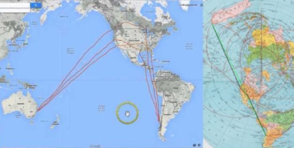 Можно заменить пролёт над Антарктидой из Сиднея в Сантьяго перелётом через Тихий океан, оставаясь в Южном полушарии на протяжении всего пути. Дозаправку можно было бы производить в Новой Зеландии или других пунктах назначения Южного полушария. Однако рейсы Сантьяго-Сидней следуют в Северное полушарие, делая остановки в североамериканских аэропортах. Затем они продолжают путь обратно в Южное полушарие. Такое возможно на плоской Земле.