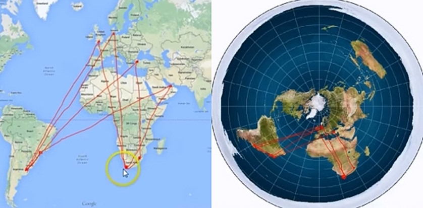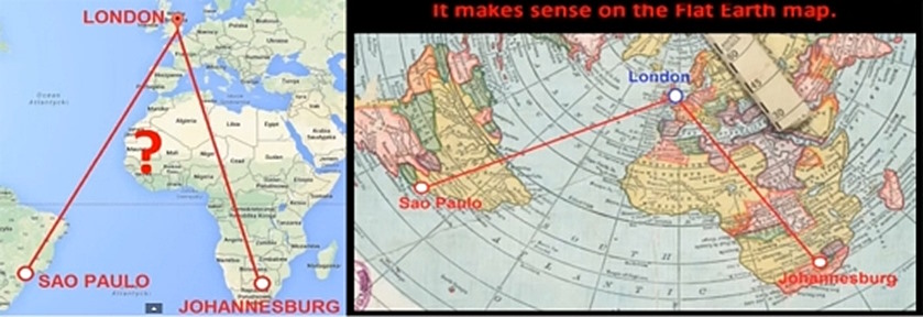 На шарообразной Земле полёт Кейптаун, Южная Африка, в Буэнос-Айрес, Аргентина прямой путь через Атлантику. Вместо этого, каждый рейс сначала летит в Северное полушарие. Там останавливается где угодно от Лондона до Турции и Дубая. Это имеет смысл лишь на плоской Земле.
