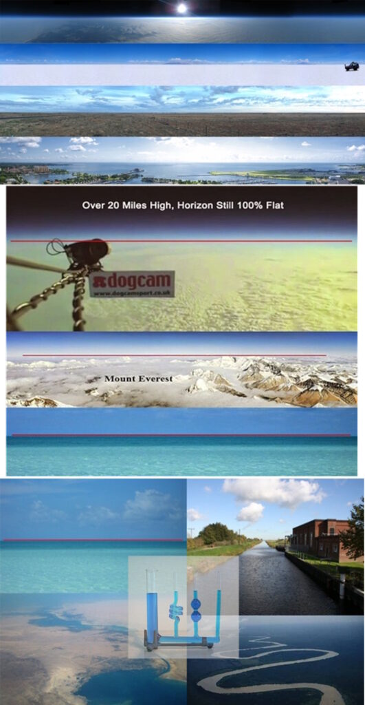 Горизонт всегда выглядит идеально плоским на 360 градусов вокруг наблюдателя, вне зависимости от высоты. Все любительские кадры с воздушных шаров, ракет, самолетов и дронов показывают абсолютно плоский горизонт на высоте более 32 км.