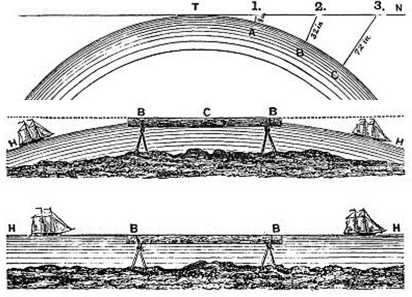 В состоянии покоя вода стремится к образованию горизонтальной поверхности. Однако на шарообразной Земле поверхность всей стоячей воды должна изгибаться вниз на 8 дюймов на милю, умноженные на квадрат расстояния. Все эксперименты показали, стоячая вода всегда идеально ровная.