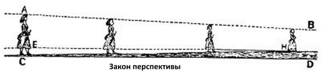 Например, девушка в платье, уходящая к горизонту, будет казаться тонущей в Земле по мере того, как она будет отходить. Сначала из вида исчезнут её ноги. Расстояние между землёй и подолом её платья будет постепенно уменьшаться. Вскоре платье коснётся земли. На плоских поверхностях, самые низкие части предметов, удаляющиеся от наблюдателя, исчезают раньше самых высоких.