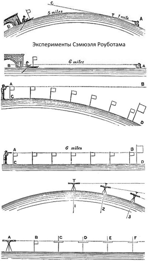 Доктор Роуботам провёл много разных экспериментов с использованием телескопов, спиртовых уровней, секстантов, теодолитов, специальных точных инструментов, используемых для измерения углов в горизонтальных или вертикальных плоскостях. Размещая их на одинаковой высоте и последовательно направляя друг на друга, он снова и снова доказывал, что Земля совершенно плоская на протяжении многих миль без какой-либо кривизны.