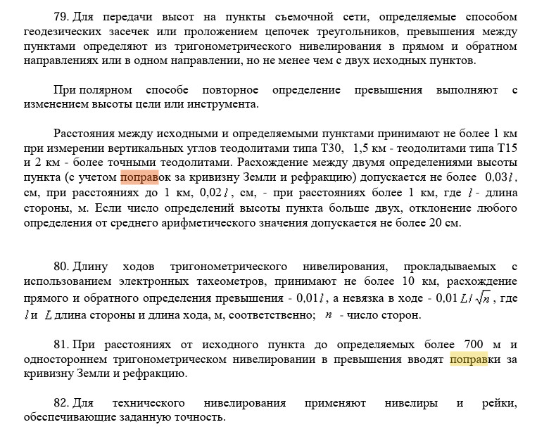 Вот, что там написано: «79. …Расстояния между исходными и определяемыми пунктами принимают не более 1 км при измерении вертикальных углов теодолитами типа Т30, 1,5 км — теодолитами типа Т15 и 2 км — более точными теодолитами. Расхождение между двумя определениями высоты пункта (с учётом поправок за кривизну Земли и рефракцию) допускается не более 0,03 см, при расстояниях до 1 км, 0,02 см, — при расстояниях более 1 км, где — длина стороны, м. Если число определений высоты пункта больше двух, отклонение любого определения от среднего арифметического значения допускается не более 20 см.