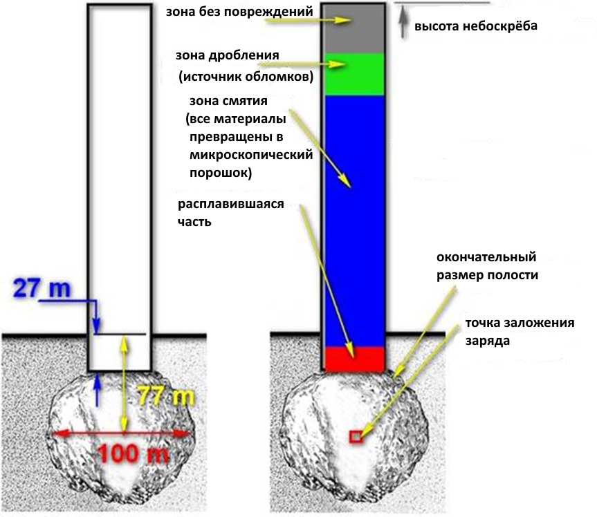 Например, взрыв 150-ти тонного заряда, помещённого глубоко в гранитной породе, вызовет появление подземной полости диаметром примерно 100 метров. Все небоскрёбы имеют фундамент. Его нижняя точка находится на глубине 20-30 метров ниже поверхности земли.