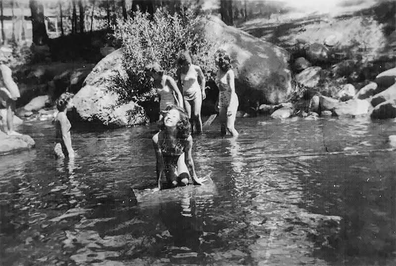 На фотографии тринадцатилетняя Барбара Кент (в центре) и её подруги по лагерю играют в реке вблизи от Руидосо, штат Нью-Мексико. Это было 16 июля 1945 года, вскоре после взрыва. С неба падали почти белые хлопья радиоактивной опыли. Барбара рассказывает: «Мы думали, что это снег. Но странное дело: вместо того, чтобы быть холодным, как снег, он был тёплым».