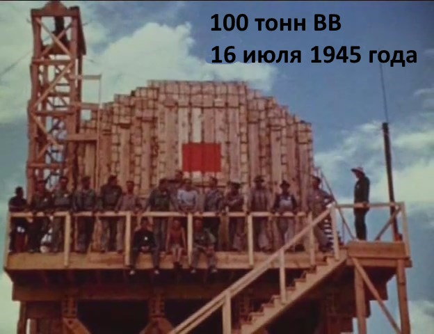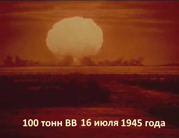Испытывали новое оружие. Знания о последствиях его применения – отсутствовали. Для запуска цепной ядерной реакции деления применили большое количество обычного ВВ (100 тонн). При взрыве большого количества тротила образуются грибовидное облако. Оно формируется из раскалённого газа, частиц пыли и обломков. Взрыв тротила создаёт мощную взрывную волну. Она распространяется во все стороны, сжимая и нагревая воздух.