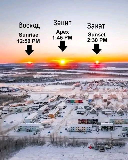 P.S. Город Инувик, Канада. В нём день длится всего 91 минуту. На картинке: восход, зенит, закат. Это предпоследний день перед началом полярной ночи. Свет даёт небесный купол. Солнце служит для создания теней.