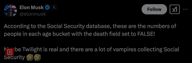 Маск сказал: «В США гораздо больше номеров социального страхования, чем граждан. Это может быть крупнейшее мошенничество в истории». Проверки выявили, что в обращении находится около 531 миллиона уникальных номеров социального страхования. Тысячи из них могут использоваться для совершения мошенничества с персональными данными.