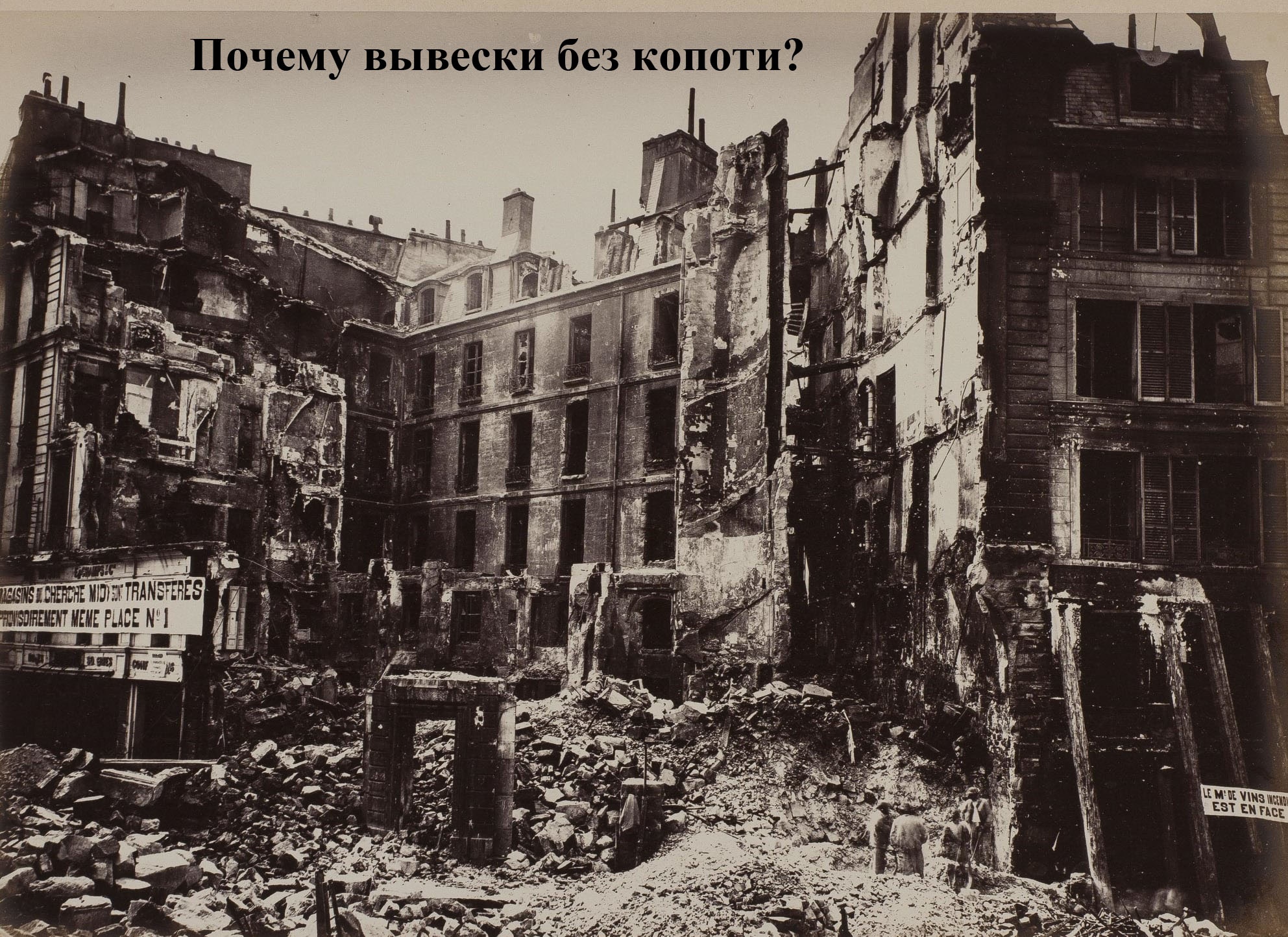 Обзор от ИИ: «В период франко-прусской войны 1870-1871 годов Париж был осаждён. В результате осады и последующего восстания, город претерпел значительные разрушения. После падения Парижа, в марте 1871 года, в городе вспыхнуло восстание, известное как Парижская Коммуна.