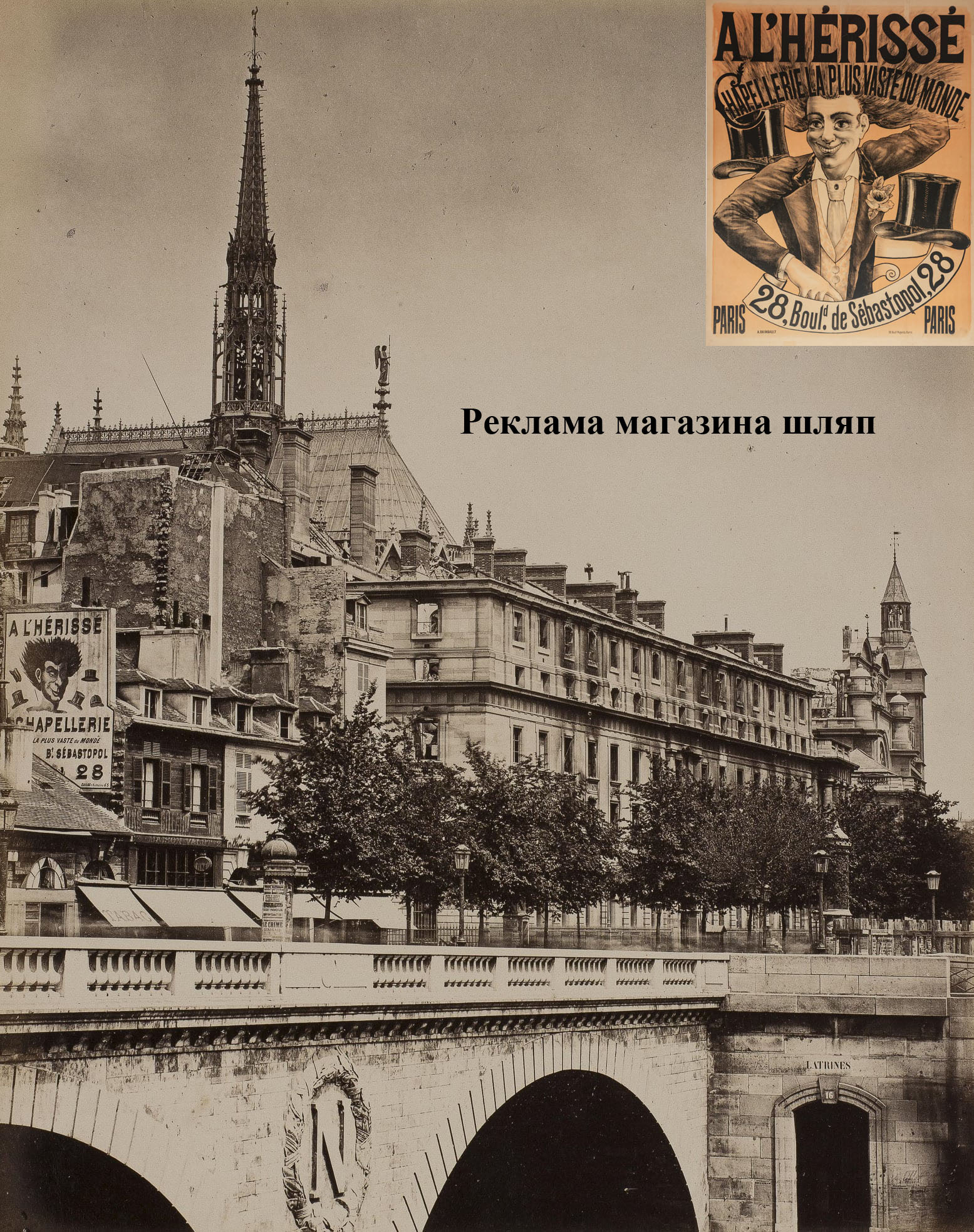 На фотографии имеется реклама магазина шляп. Обзор от ИИ: «Магазин шляп «A L’HERISSE» – это крупнейший в мире магазин шляп. Он находился в Париже на бульваре Севастополь, 28.