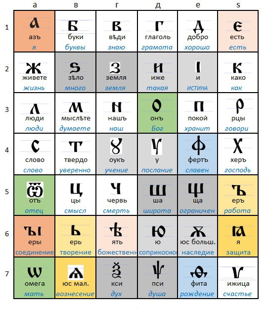 «Там русской дух, там Русью пахнет». Русскую буквицу можно читать горизонтально, вертикально, горизонтально и вертикально по столбцам. Каждый раз будет разные, связанные смыслом, предложения. Например, горизонтальное прочтение: «Я буквы знаю. Грамота – это замечательно. Жизнью наполнена Земля. Такая истина. Как люди думаете, нас бог хранит? Говори слова твердо учения. Посылает святой господь отец смысл жизни (смерти): расширение пространства упорным трудом, познание в единстве вселенной, созданной богом; сохранение рода; вознесение духа; душе достижение блаженства».