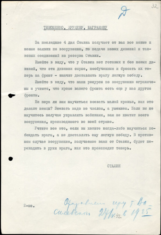 Иногда фальсификация выявляется по одной лишней букве. Имеется «архивный» документ – шифртелеграмма И. В. Сталина. Она отправлена 27.05.1942 года Тимошенко, Хрущёву, Баграмяну. «О необходимости изменения методов ведения войны для достижения победы» (Российский государственный архив социально-политической истории, Ф. 558, Оп. 11, Д. 441, Л. 32.).