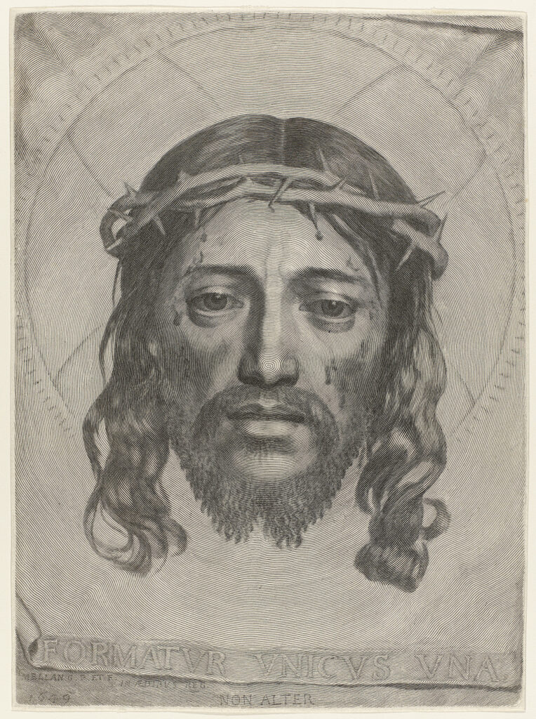 На гравюре образ Иисуса Христа выполнен спиральной линией переменной толщины. В нижней части Меллан поместил надпись на латыни: «FORMATUR UNICUS UNA» (выполнен как никакой другой) и ниже: «NON ALTER» (неповторим).