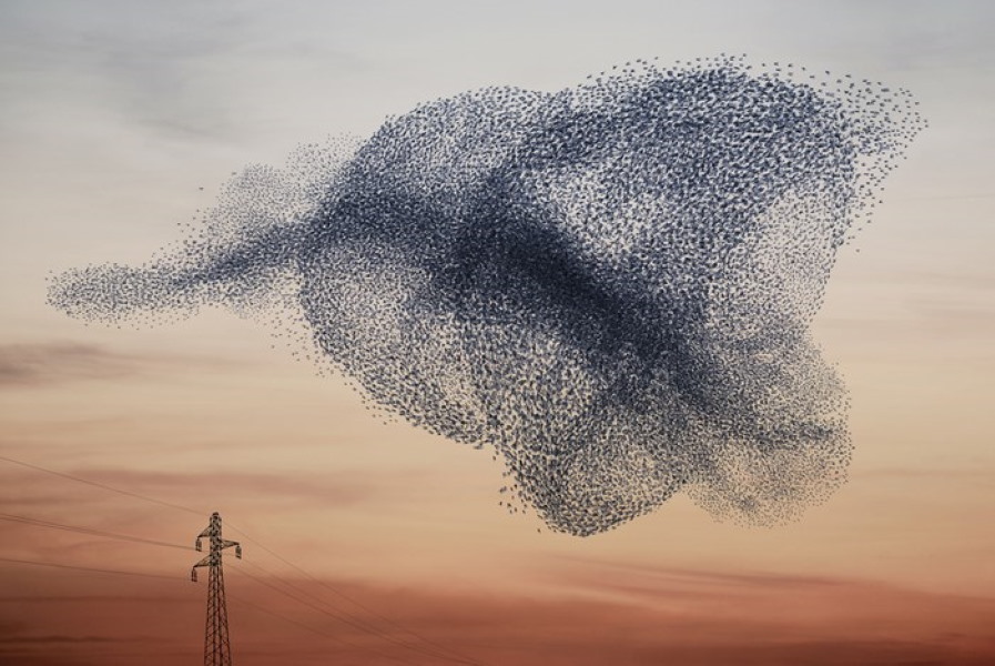 Представьте, как тысячи птиц одновременно меняют направление своего полёта. Создают удивительные фигуры в воздухе, состоящие из тысяч участников. Они собираются в какие-то шары, то вытягиваются лентами. При этом в одной и той же стае часть птиц может лететь вниз, а другая – продолжать лететь по горизонтали. Это завораживающие зрелище. Обычно такие «фигуры высшего пилотажа» птицы показывают на закате. Их движение в небе напоминает перемещение косяков рыб под водой, которые также синхронно показывают сложные фигуры. Причины такой самоорганизации птиц до сих пор остаются загадкой.