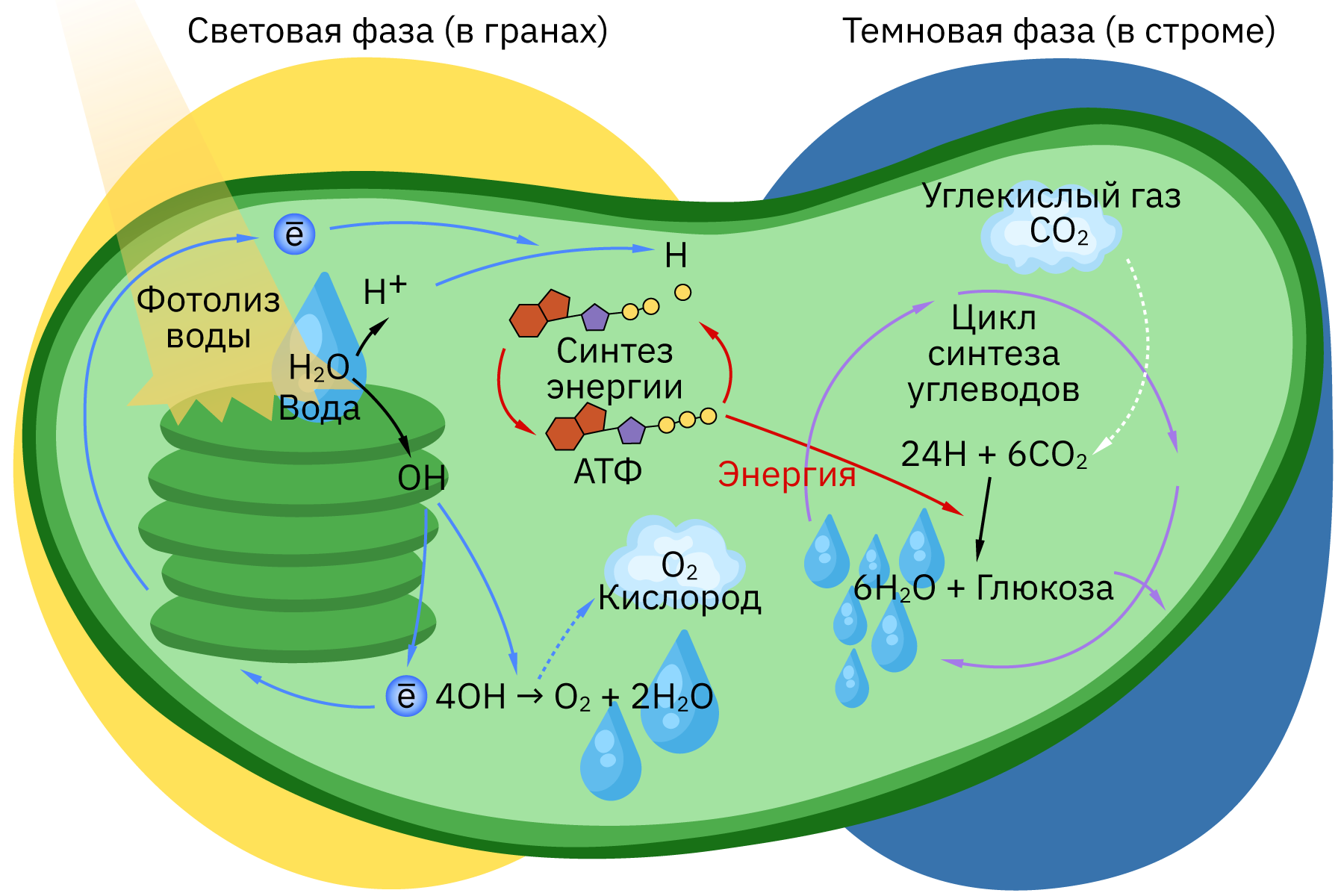 — фотосинтез характерен лишь для зелёных частей растения, т.е. частей, содержащих хлорофилл;