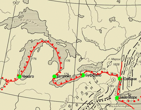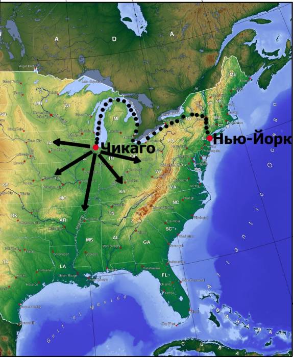 До этого момента между британскими колониями в Северной Америке (США) отсутствовала территориальная конкуренция. Каждый действовал у себя вдоль Атлантического океана в пределах Аппалачей. В 1825 году Нью-Йорк прорвался в Великие американские озёра. От Чикаго, он начал экспансию на дикие места верховьев бассейна Миссисипи.