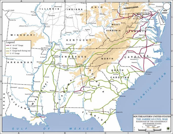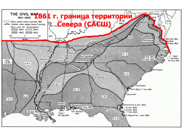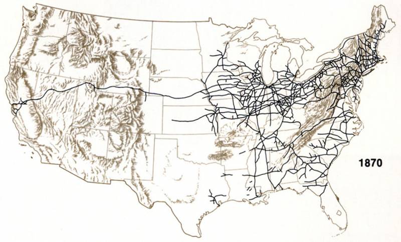 Имеются карты состояния железных дорог к моменту начала Гражданской войны в США, то есть к 1861 году. С помощью железных дорог и северные, и южные штаты, практически одновременно, в 1850-х годах проникли в бассейн Миссисипи (Средний Запад). Они шли навстречу друг другу. По пути Северные и южные штаты захватывают территории и уничтожают индейцев.