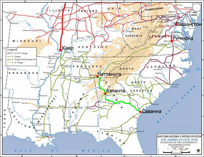 Посмотрим на ход наступательных действий Севера в ходе Гражданской войны. В 1862 году рейд армии северян от их железнодорожного форпоста Каира вниз по Миссисипи к Новому Орлеану. В 1864 году рейд генерала Шермана к морю по железной дороге от Чаттануги через Атланту на Саванну. Финальный этап – захват столицы южан Ричмонда. Попутно войска доблестного генерала Шермана уничтожали племена индейцев.