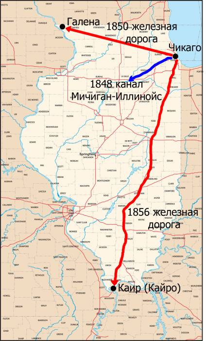 В 1848 году был построен канал Мичиган-Иллинойс. В 1850 году проложена самая первая железная дорога от Чикаго до города Галена. В период 1851-1856 годы была построена дорога Illinois Central Railroad до Каира (Кайро). Он расположен в стратегической точке на слиянии Миссисипи и Огайо.